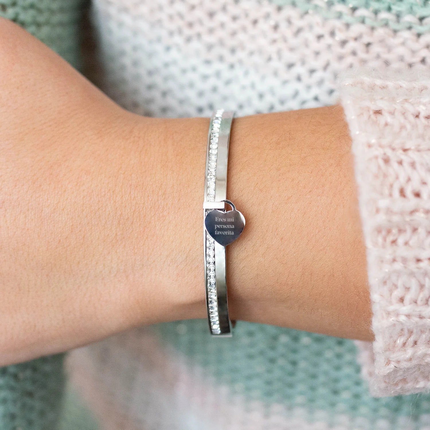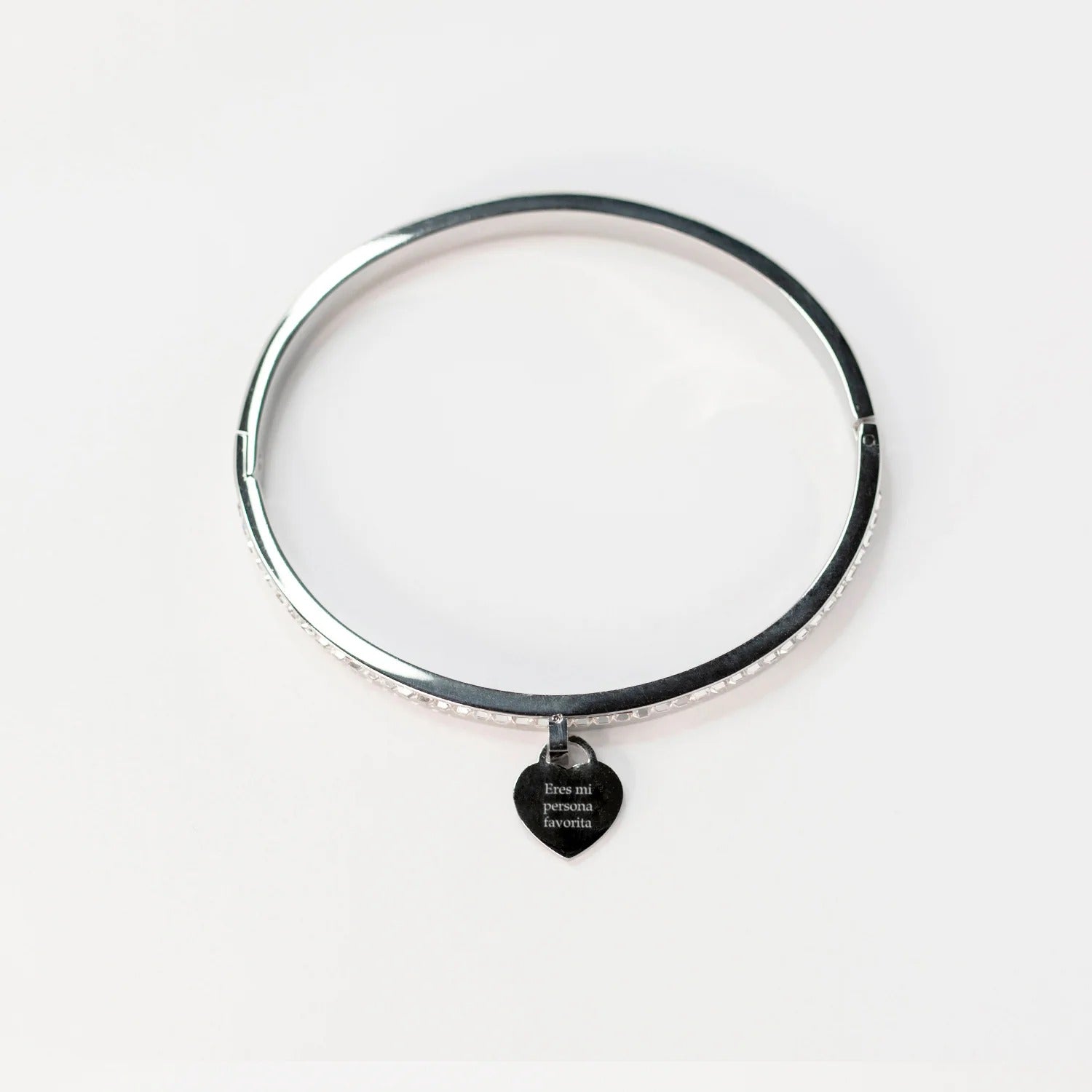 Su diseño incluye una fina línea de zirconias brillantes que aportan un toque sofisticado y un colgante en forma de corazón grabado con la frase: