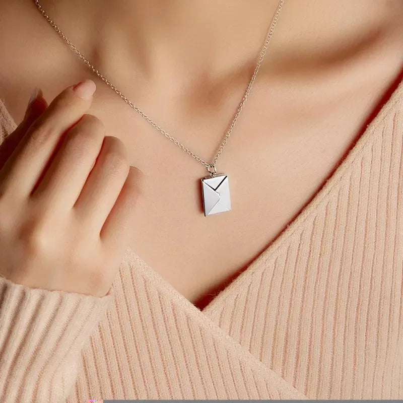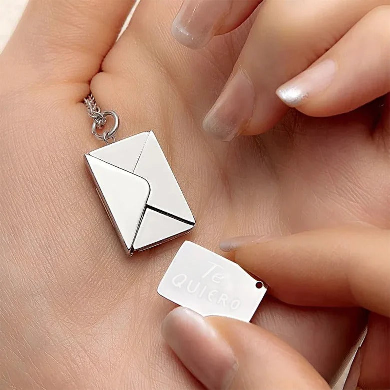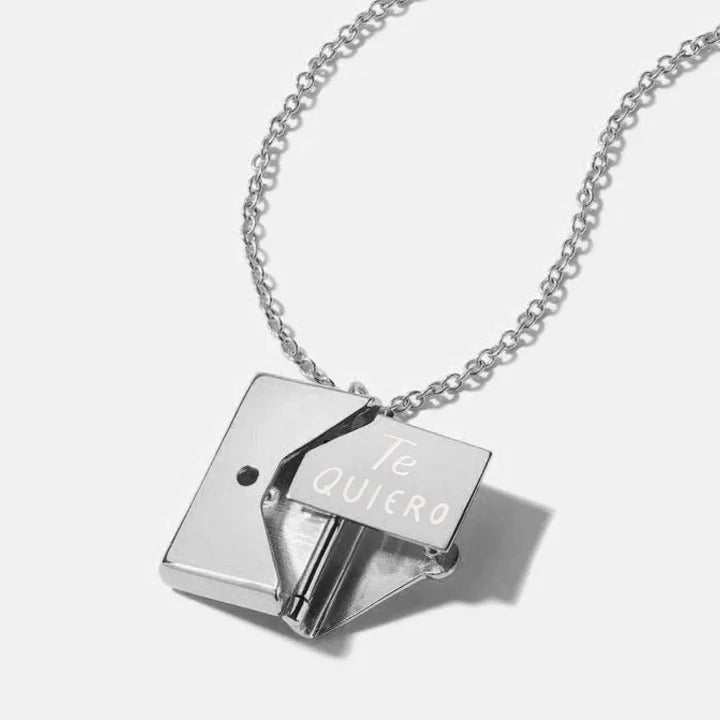El Collar “Mensaje Oculto – Te Quiero” es una joya única diseñada para sorprender. A simple vista, parece un colgante moderno y minimalista con acabado dorado o plateado, pero al abrirlo revela una pequeña placa con un mensaje grabado: